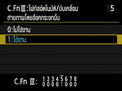 แม้ว่าคุณจะใช้ขาตั้งกล้อง การสั่นสะเทือนของกระจกก็อาจทำให้เกิดกล้องสั่นได้ ตั้งคุณสมบัติ [ถ่ายภาพโดยล็อคกระจกขึ้น] ไปที่ [ใช้งาน] เมื่อคุณถ่ายภาพทิวทัศน์ยามค่ำคืนด้วยช่องมองภาพ เมื่อเปิดใช้งานคุณสมบัตินี้ คุณต้องกดปุ่มชัตเตอร์สองครั้งเพื่อถ่ายภาพ