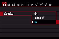หากเสียงเตือนยืนยันดังขึ้นมาตอนที่กล้องจับโฟกัสได้หรือถ่ายแบบตั้งเวลา อาจทำให้ลูกน้อยกลัวได้ ดังนั้น เราแนะนำให้ปิดเสียงเตือนเสียก่อน โดยตั้งค่า [เสียงเตือน] ในแท็บ [Shooting 1] เป็น [ปิด]