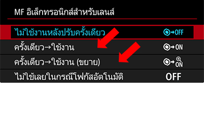 1. ในเมนู MF แบบอิเล็กทรอนิกส์ของเลนส์ ให้ตั้งเมนูข้อใดข้อหนึ่งด้านล่างนี้ไปที่ ‘ON’