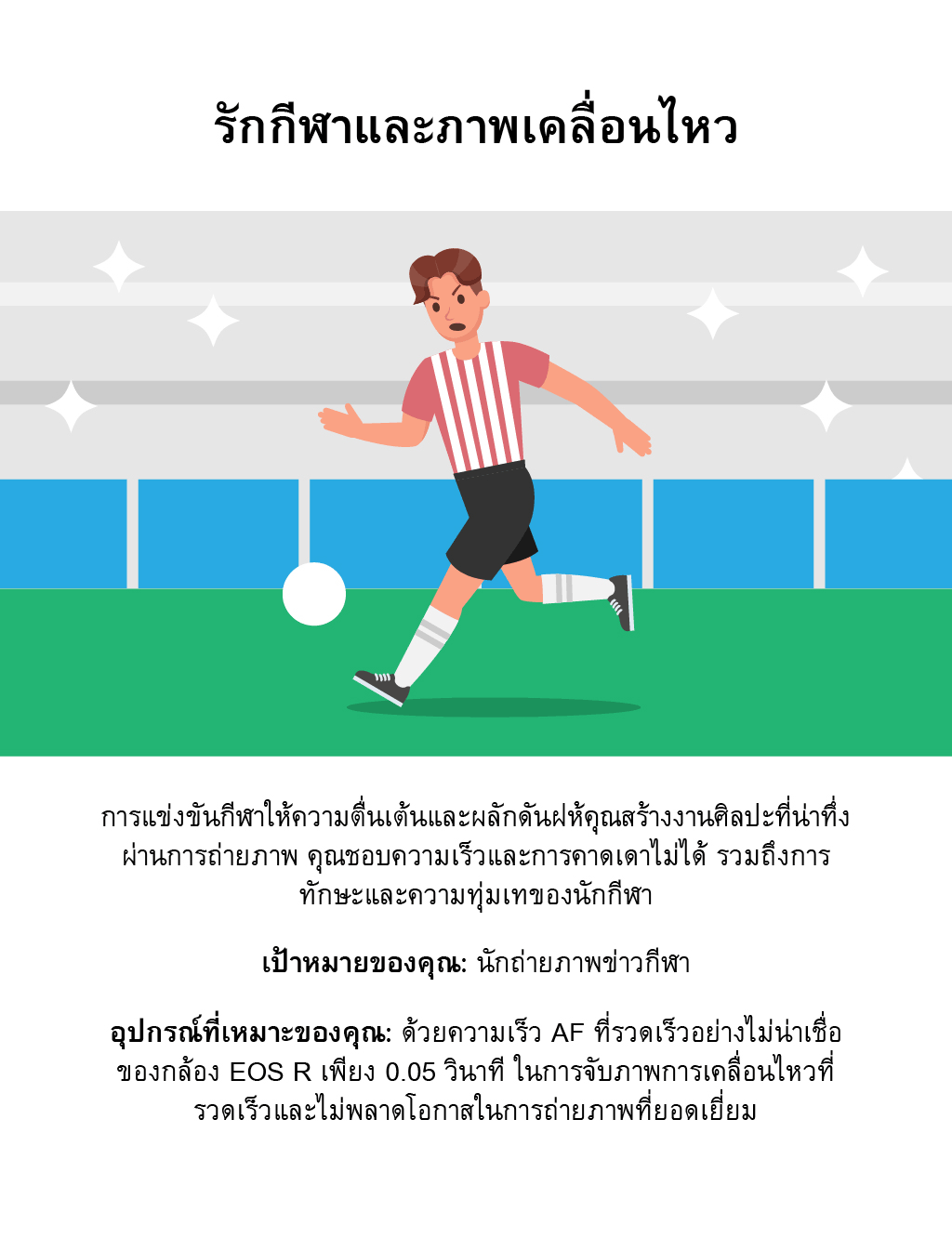 คุณรักการจับภาพช่วงเวลาสำคัญของกีฬา ที่ซึ่งร่างกายและจิตใจถูกผลักดันจนถึงขีดจำกัดสูงสุด คุณชอบที่จะเปิดเผยทุกจุดที่น่าสนใจ การตัดสินใจ และความมุ่งมั่นของคู่แข่ง
