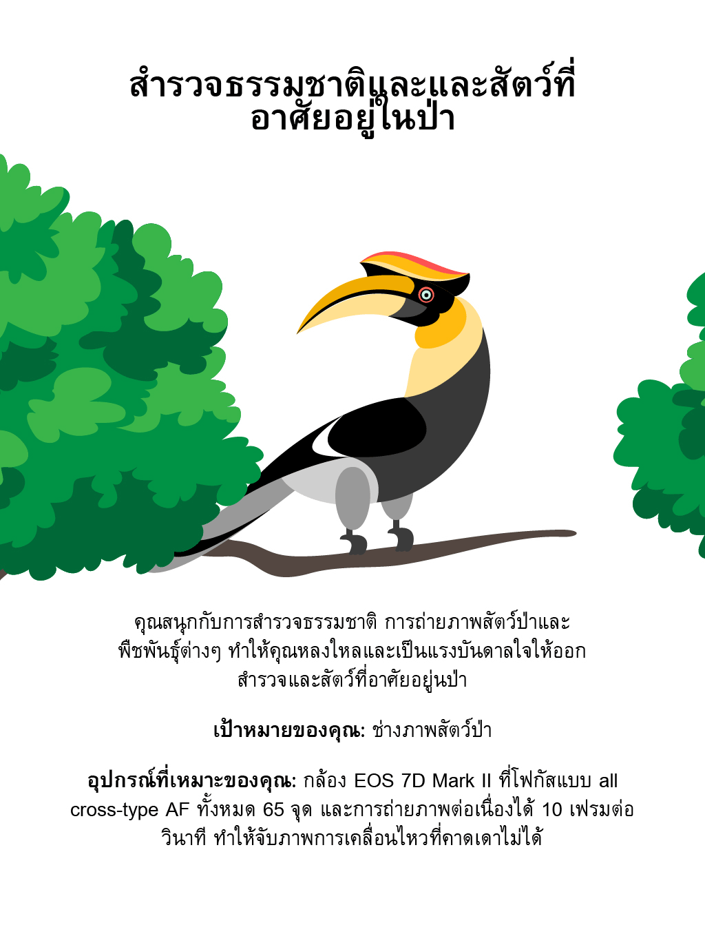อุปกรณ์ที่เหมาะของคุณ: EOS 7D Mark II ด้วยตัวประมวลผลภาพ DIGIC 6 คุณจะได้ความยืดหยุ่นและพลังในการถ่ายภาพในสภาวะและสภาพแสงที่แตกต่างกัน และการโฟกัสแบบ all cross-type AF ทั้งหมด 65 จุด และการถ่ายภาพต่อเนื่อง 10 เฟรมต่อวินาที คือ สิ่งที่ยอดเยี่ยมสำหรับการจับภาพการเคลื่อนไหวที่คาดเดาไม่ได้