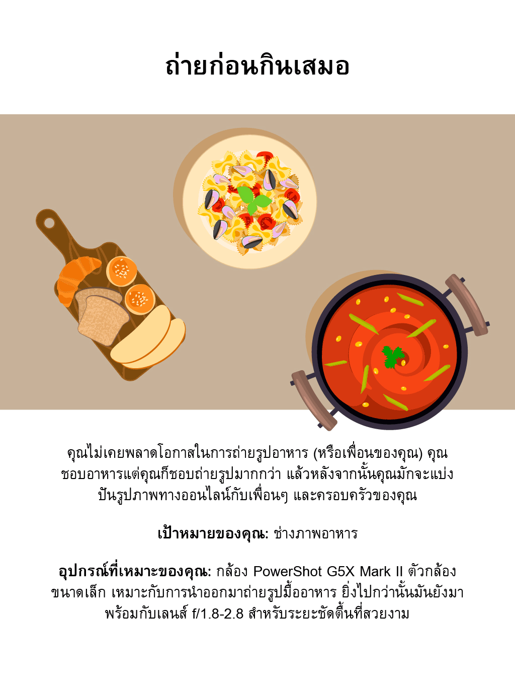 อุปกรณ์ที่เหมาะของคุณ: กล้อง PowerShot G5 X Mark II ตัวกล้องเล็กที่ออกแบบมาอย่างดี พร้อมคุณสมบัติอันทรงพลัง เช่น ช่องมองภาพอิเล็กทรอนิกส์แบบป๊อปอัพ เลนส์ f/1.8-2.8 สำหรับการถ่ายภาพคุณภาพสูงแม้ในสภาพแสงน้อย รวมถึงการเชื่อมต่อ Wi-Fi ที่ให้คุณถ่ายโอนภาพถ่ายของคุณ ได้อย่างง่ายดายจากกล้องไปยังโทรศัพท์ของคุณ เหมาะสำหรับการโพสต์บนโซเชียลมีเดียเป็นที่สุด!