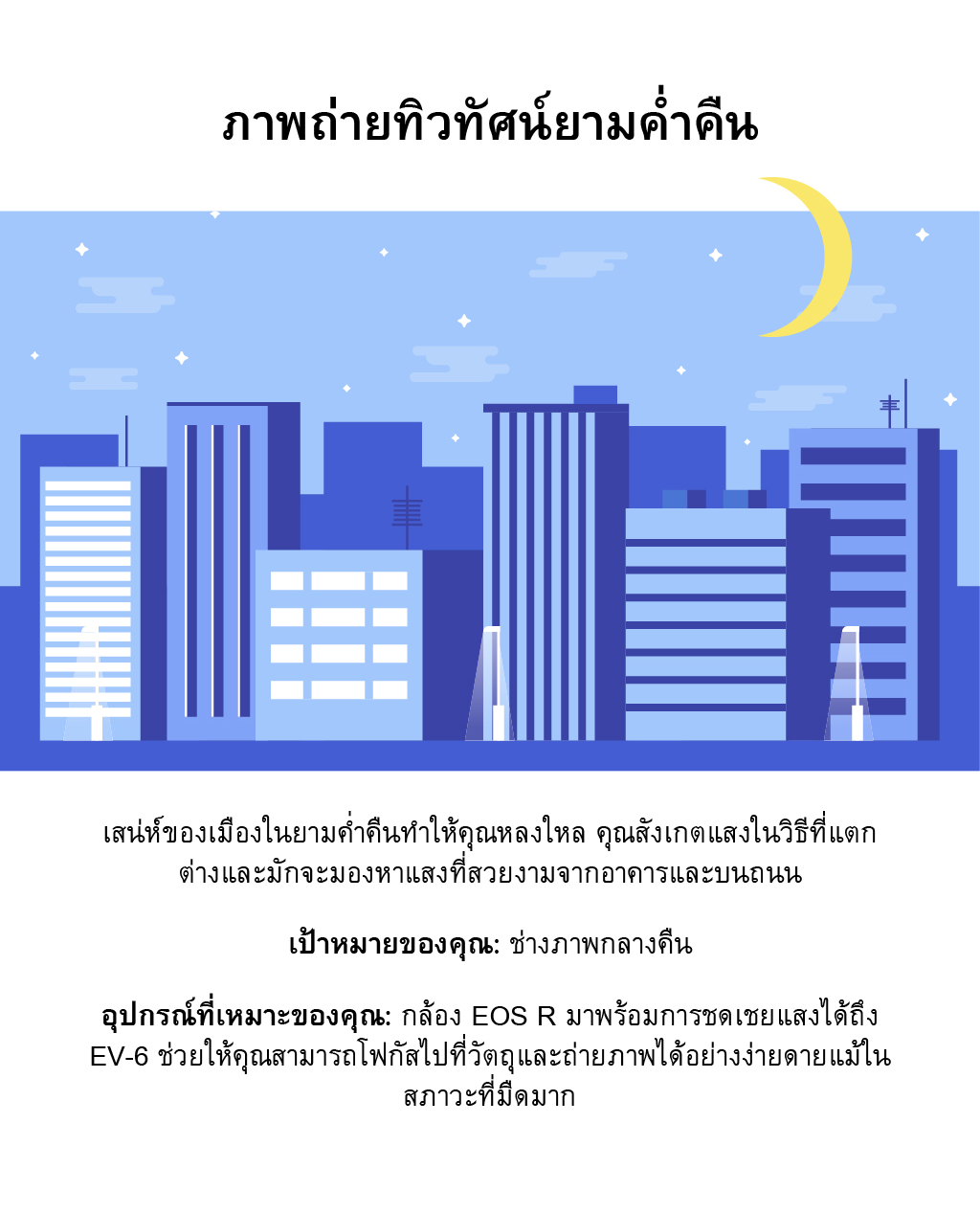 อุปกรณ์ที่เหมาะของคุณ: กล้อง EOS R หนึ่งในกล้องที่ดีที่สุดของกล้องในตนะกูล EOS R ด้วยความสามารชดเชยแสงถึง EV-6 หมายความว่า กล้องจะช่วยให้คุณโฟกัสไปที่วัตถุแม้ในสภาพแสงน้อยมาก หากการถ่ายภาพกลางคืนเป็นสิ่งที่คุณต้องการ กล้อง EOS R ถือเป็นตัวเลือกที่เหมาะสมสำหรับคุณ