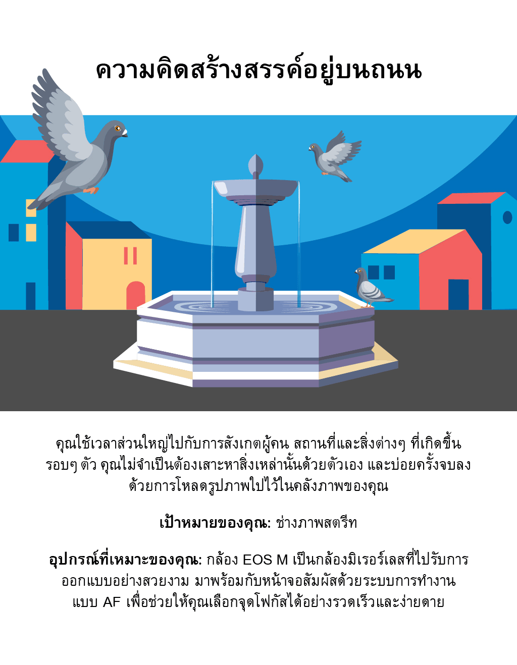 อุปกรณ์ที่เหมาะของคุณ: ต้องการดูเท่ตอนถ่ายภาพท้องถนนใช่ไหม? นอกจากจะดูราวกับฮิปสเตอร์แล้ว กล้อง EOS M5 ยังเป็นสุดยอดของกล้องมิเรอร์เลสที่มาพร้อมกับ Dual Pixel CMOS AF (สามารถโฟกัสอัตโนมัติได้อย่างรวดเร็วเป็นพิเศษ) และคุณสามารถแตะที่หน้าจอเพื่อใช้งานระบบการทำงานแบบ AF เลือกจุดโฟกัสบนหน้าจอ LCD ได้เลย