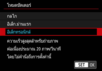 ข้อควรรู้: สำหรับกล้องบางรุ่น โหมดชัตเตอร์อิเล็กทรอนิกส์อาจเป็นที่รู้จักกันในอีกชื่อหนึ่ง เช่น 'โหมดชัตเตอร์แบบเงียบ’ และสามารถพบได้ในโหมด SCN