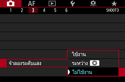หมายเหตุ: คุณสามารถเปิดการจำลองระดับแสงทิ้งไว้ได้หากใช้แฟลชของ Canon