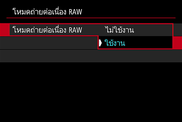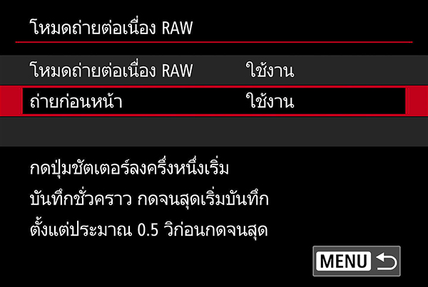 เมื่อเปิดใช้งานโหมดถ่ายต่อเนื่องแบบ RAW แล้ว จะสามารถใช้ฟังก์ชั่นการถ่ายภาพล่วงหน้าได้ เลือกเพื่อเปิดใช้งาน
