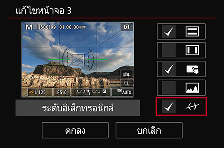 หากต้องการดูระดับอิเล็กทรอนิกส์ในหน้าจอ EVF ของคุณ ให้เลือก “ข้อมูลช่องมองภาพ/การตั้งค่าการสับเปลี่ยน” และทำขั้นตอนที่ 3 และ 4 ซ้ำอีกครั้ง หมายเหตุ: หน้าจอ VF แรกจะไม่สามารถแก้ไขได้