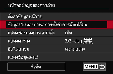 หากต้องการดูฮิสโตแกรมในหน้าจอ EVF ของคุณ ให้เลือก “ข้อมูลช่องมองภาพ/การตั้งค่าการสับเปลี่ยน” และทำขั้นตอนที่ 3 และ 4 ซ้ำอีกครั้ง หมายเหตุ: หน้าจอ VF แรกจะไม่สามารถแก้ไขได้