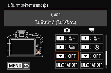 ขั้นตอนที่ 2: เลือกปุ่มที่จะกำหนดฟังก์ชั่นขยายให้ แล้วกดปุ่ม SET สำหรับบทความนี้ เราเลือกปุ่มเลื่อนลงซึ่งไม่มีฟังก์ชั่นใดๆ ในการถ่ายแบบ Live View ด้วยกล้อง EOS R50