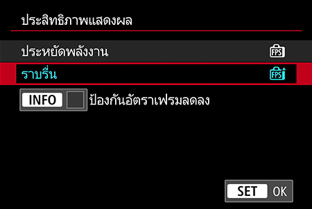 กล้องอย่าง EOS R7 มีการตั้งค่าการแสดงผล “ราบรื่น” ซึ่งมีอัตราแสดงผลสูงสุดถึง 120 fps ทำให้ภาพตัวอย่างดูลื่นไหลขึ้นเวลาแพนกล้อง การตั้งค่าเริ่มต้นไว้ช้าๆ อาจดูกระตุกเวลาแพนกล้องตามตัวแบบที่เคลื่อนที่ไวมาก