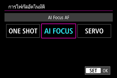 - AI Focus: กล้องจะใช้ฟังก์ชั่นการตรวจจับฉากอัจฉริยะเพื่อสลับไปมาระหว่างโหมด One Shot กับ Servo