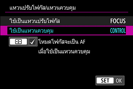 หากเลนส์มีวงแหวนปรับโฟกัส/วงแหวนควบคุมรวมกัน ฟังก์ชั่นของวงแหวนอาจถูกตั้งไว้ที่ “Focus” หากมีปุ่มสวิตช์ ให้ตั้งค่าเป็น “Control” แต่หากไม่มีปุ่มสวิตช์ ให้ทำตามขั้นตอนต่อไปนี้