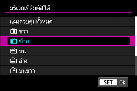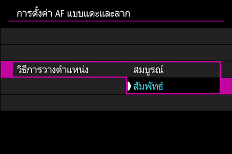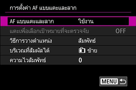 ที่: เมนูสีชมพู → “การตั้งค่า AF แบบแตะและลาก”