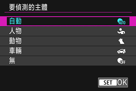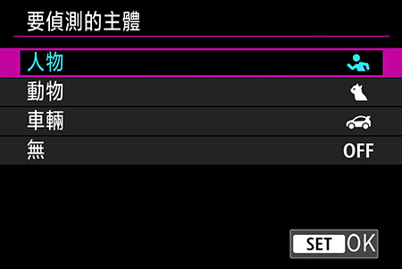 如果您在「要偵測的主體」功能表中選擇了「無」,則即使在自動對焦功能表中啟用了眼睛偵測,其也無法運作。
