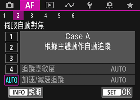 改變伺服自動對焦的案例可以在極大的程度上改變追蹤行為。大多數情況下,案例 1 或自動應已足夠。但對於特定的場景,或如果您只是想對追蹤行為有更多的掌控,您可嘗試不同的案例或調整參數。