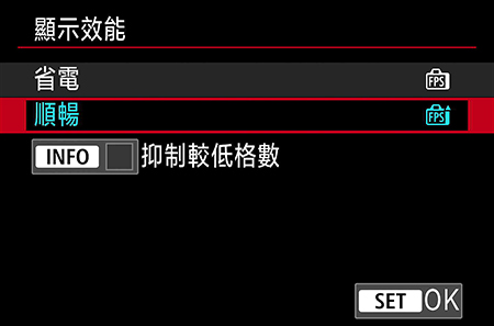 敬請深入瞭解:當您半按快門按鈕並開展自動對焦操作時,顯示效能將切換到 60 fps,直到拍攝圖像完成為止。