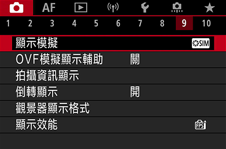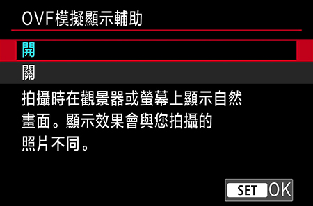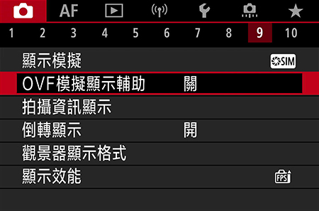 在 SHOOT9 選單上,選擇「OVF 模擬查看輔助」。