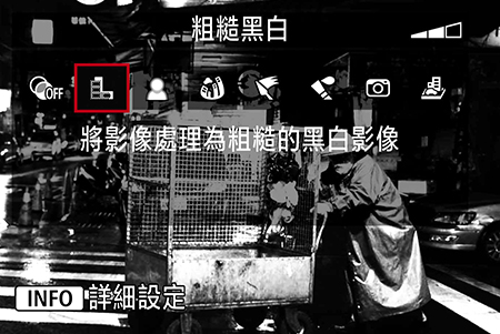 不可不知:「創意濾鏡:粗糙黑白」及「相片風格:單色」兩種效果皆可在拍攝后在相機内直接應用到照片中。