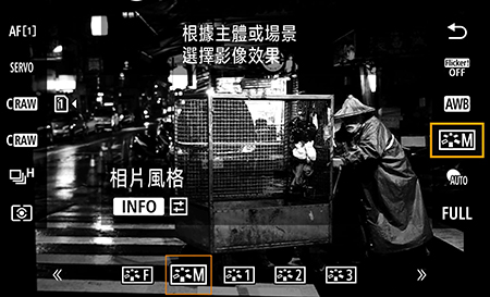 點按/移至相片風格的圖標。點選帶有「M」的圖標以啟用單色設定。