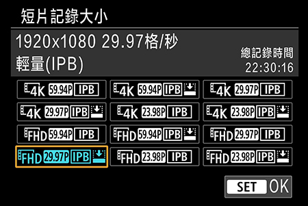 幀率定會顯示在「短片拍攝尺寸」功能表的拍攝尺寸旁邊,並可以此設定每秒拍攝的幀數(fps = 每秒幀數)。 「23.98P」是指 24 幀/秒,「29.97P」是指 30 幀/秒。由於技術原因,相關數字並不完整。