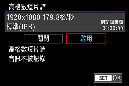 敬請深入瞭解:由於高幀率影片模式需要更多的電池電量,且最長錄製時間較短。因此,選用該模式時,請謹慎小心!