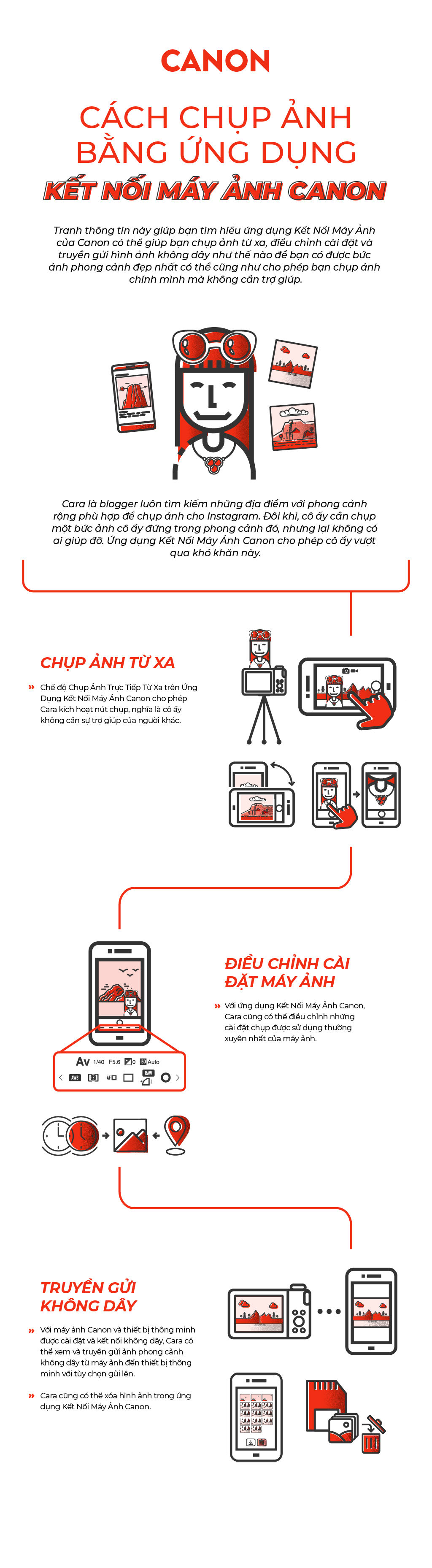 Nếu bạn chụp ảnh phong cảnh với bạn là người đứng trong khung hình, bạn sẽ cần ai đó chụp ảnh cho bạn. Hãy xem tranh thông tin để tìm hiểu ứng dụng Kết Nối Máy Ảnh đầy đủ tính năng của Canon có thể giúp bạn chụp ảnh từ xa, điều chỉnh cài đặt và truyền gửi hình ảnh không dây như thế nào để bạn có được bức ảnh phong cảnh đẹp nhất có thể cũng như cho phép bạn chụp ảnh chính mình mà không cần trợ giúp.