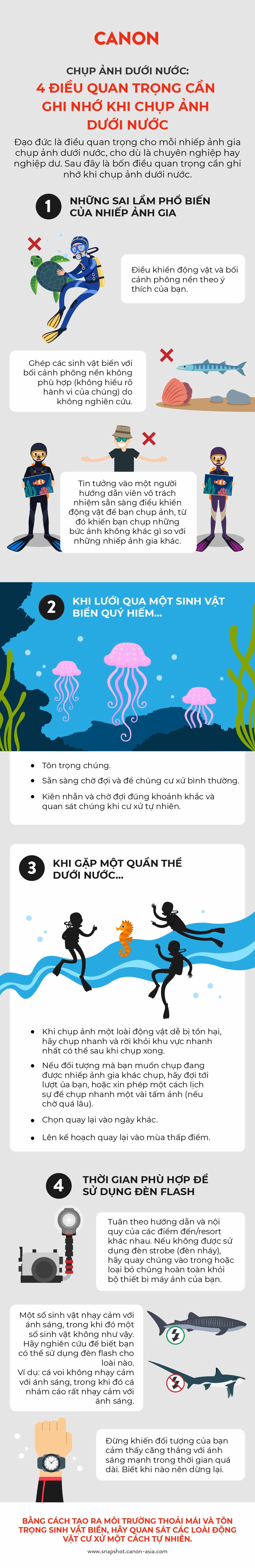 Chụp ảnh dưới nước, cũng giống như các thể loại nhiếp ảnh khác, nên được thực hiện dựa trên tinh thần tôn trọng đối tượng cũng như môi trường xung quanh. Nhiếp ảnh gia chụp ảnh dưới nước chuyên nghiệp William Tan thảo luận về những cách chụp ảnh động vật dưới nước một cách có đạo đức và cách tạo ra môi trường tốt hơn cho đối tượng chụp ảnh dưới nước của bạn.