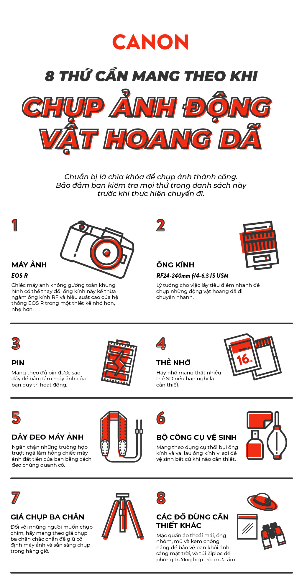 Cho dù là chụp hình trong một ngày hay tham gia chuyến đi chụp hình động vật hoang dã kéo dài cả tuần, việc đóng gói những đồ dùng cần thiết cho chuyến đi cũng quan trọng không kém việc chụp hình. Từ ống kính phù hợp, pin dự phòng và thẻ SD dự phòng, cho đến giá ba chân chắc chắn và bộ dụng cụ vệ sinh phù hợp, hãy bảo đảm bạn mang theo chúng để giúp chuyến phiêu lưu chụp ảnh động vật hoang dã của bạn thành công tốt đẹp.