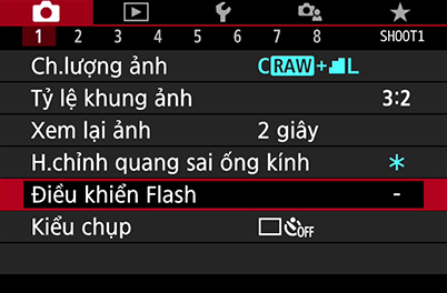 Tìm ‘Flash control’ hoặc ‘External Speedlite control’ trong trình đơn Shoot, và sau đó tìm đến hạng mục ‘External flash func. setting’ hoặc ‘Flash func. setting’.