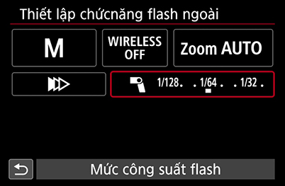 Bạn cũng có thể thay đổi mức công suất flash bằng cách chọn hạng mục trên màn hình ‘External flash func. setting”.
