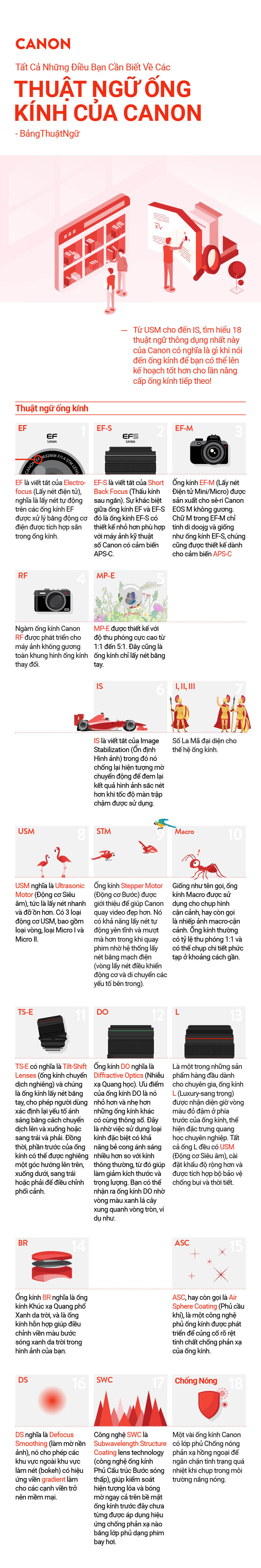 Nếu bạn mới làm quen với Canon và đang thử trải nghiệm những ống kính khác nhau hiện có, các thuật ngữ như IS, EF và USM được in khắc trên sản phẩm có thể khiến bạn không chú ý. Để giúp bạn chúng tôi đã biên soạn 18 thuật ngữ phổ biến nhất về ống kính Canon vào một tờ tranh thông tin dễ sử dụng để bạn có hiểu hiểu rõ hơn về các thuật ngữ khi muốn tìm hiểu về thiết bị bạn muốn nâng cấp tiếp theo! Hãy kiểm tra bên dưới.