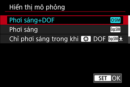 Chọn “Exposure+DOF” và sau đó nhấn nút SET. Máy ảnh của bạn lúc này sẽ hiển thị hình ảnh xem trước cả độ sáng và chiều sâu trường ảnh thực tế theo thiết lập phơi sáng của bạn.