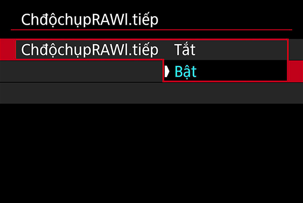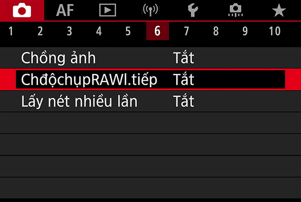 Tìm trí và chọn “RAW burst mode” trong trình đơn SHOOT (màu đỏ). Số tab tùy vào mẫu máy. Trên EOS R7, nó nằm ở Tab 6.