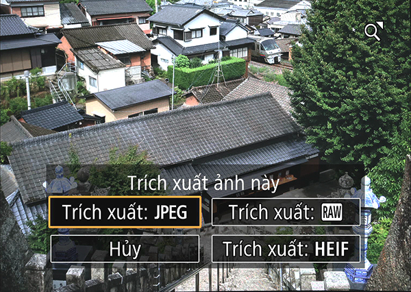 Để trích xuất một ảnh, nhấn nút SET. Trình đơn bên trên sẽ xuất hiện. Chọn định dạng mong muốn. Lưu ý rằng bạn sẽ không thể phóng to tập tin hình ảnh đã trích xuất trong máy ảnh.