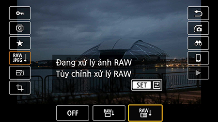 1. Ở chế độ phát lại, nhấn nút SET và tìm đến biểu tượng xử lý ảnh RAW. Chọn biểu tượng ngoài cùng để tùy biến xử lý ảnh RAW.