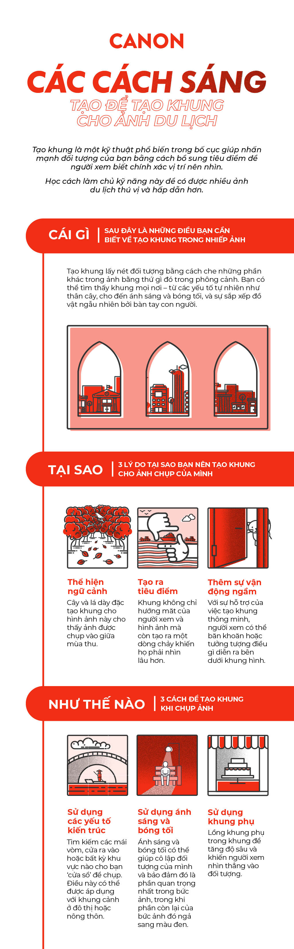Bạn đang muốn đạt được hiệu ứng thị giác mạnh hơn đối với các hình ảnh du lịch của mình? Hãy xem tranh thông tin này để biết cách tạo khung, một kỹ thuật bố cục đơn giản nhưng đổi khi bị bỏ qua, giúp định hướng mắt của người xem vào đối tượng của bạn và tăng thêm chiều sâu cũng như kích thước cho ảnh du lịch.