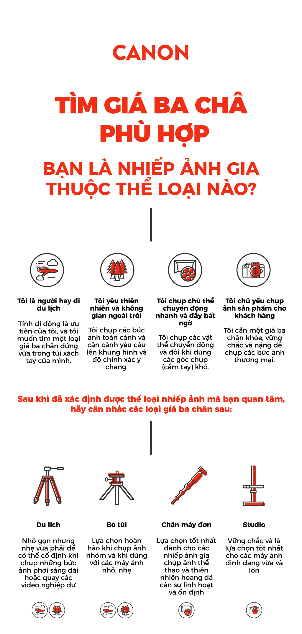 Chọn giá ba chân phù hợp có thể khiến bạn choáng ngợp bởi có quá nhiều loại và lựa chọn có sẵn trên thị trường. Trong phần infographic (đồ họa thông tin) này, chúng tôi sẽ giúp bạn đưa ra quyết định dựa trên loại hình nhiếp ảnh mà bạn quan tâm.