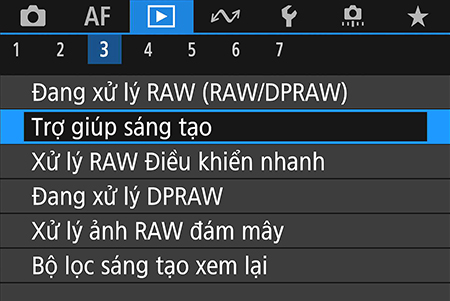 Creative Assist nằm trong trình đơn màu lam, ở đó có các chức năng xử lý RAW khác trong máy ảnh.