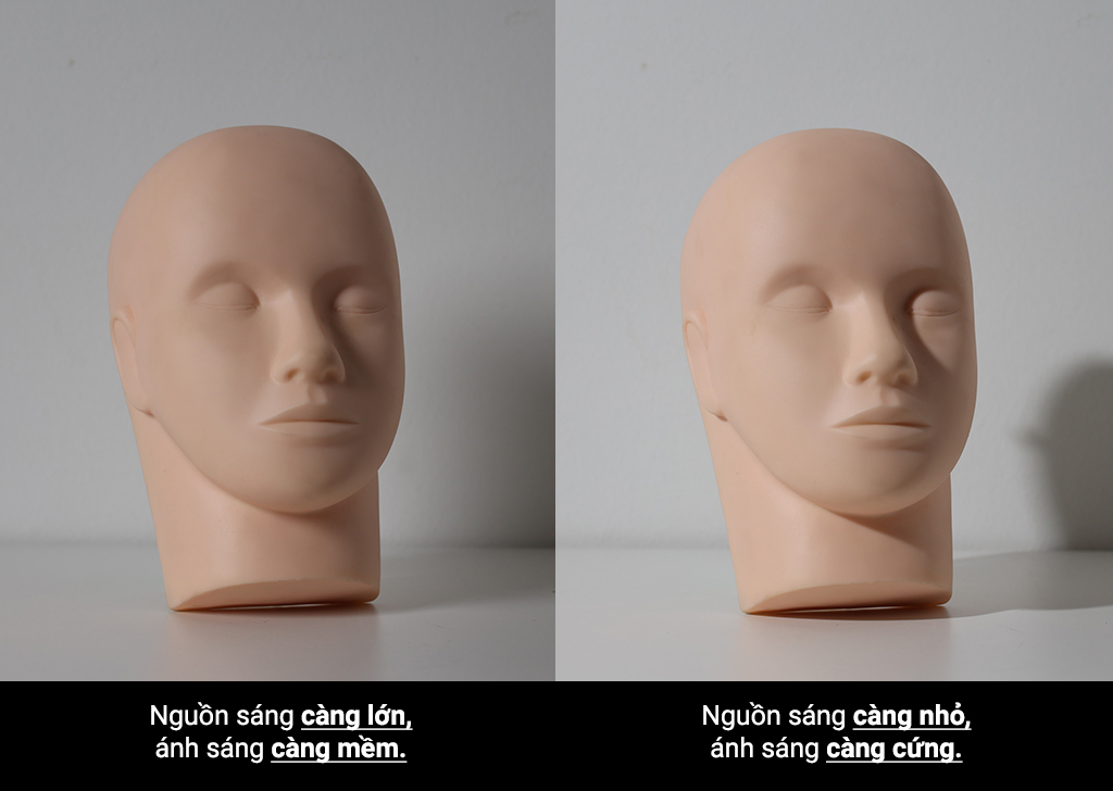 Nguồn sáng kích thước lớn sẽ bao bọc ánh sáng xung quanh đối tượng, giúp lấp đầy vùng tối, tạo ra hình ảnh trông mềm mại hơn. Tuy nhiên, nguồn sáng kích thước nhỏ hơn sẽ chiếu vào đối tượng, tạo ra các vùng tối mạnh hơn.