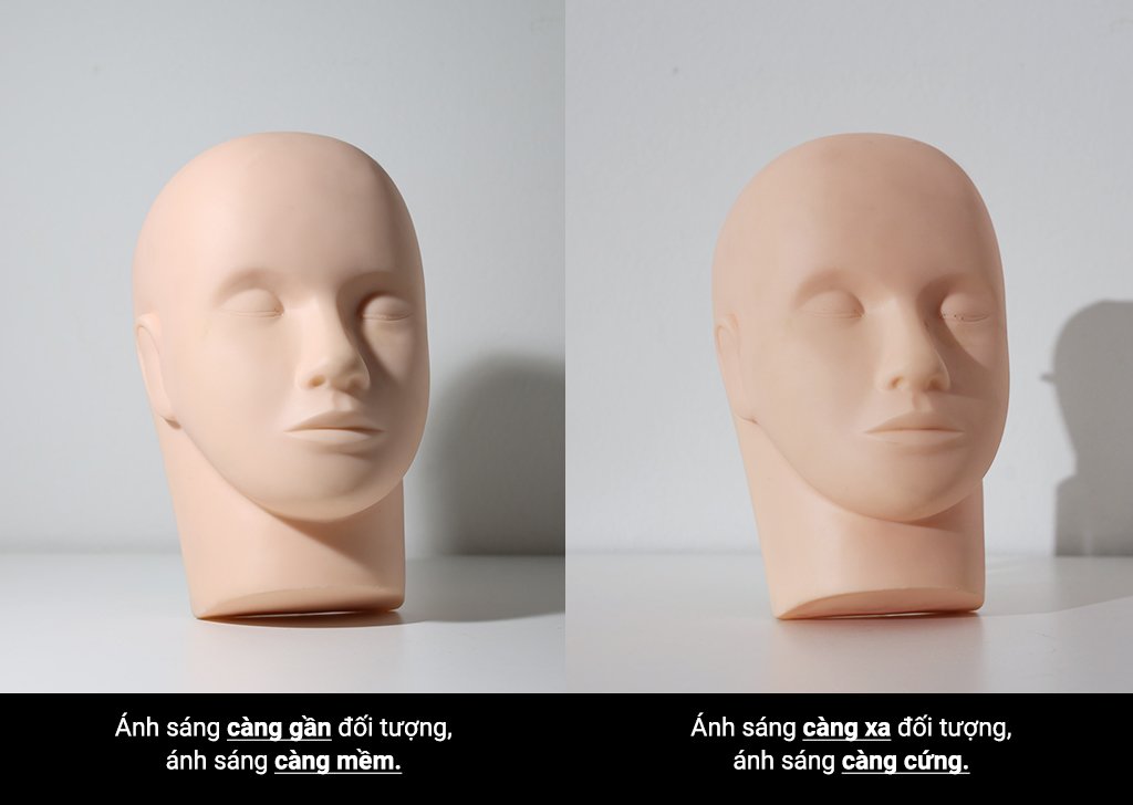 Khi ánh sáng càng gần đối tượng (bên trái) ở khoảng cách 1m, vùng tối mềm hơn so với vùng tối cứng khi di chuyển ánh sáng ra xa cách đối tượng 3m.