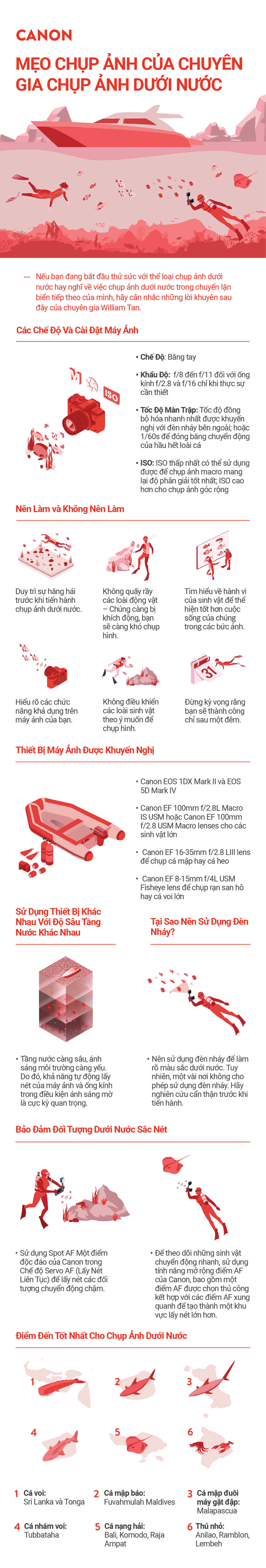 Chụp ảnh dưới nước không chỉ là mang máy ảnh xuống dưới nước và bấm nút chụp. Bạn cần chuẩn bị thiết bị cần thiết, kiến thức về sinh vật biển và kỹ năng liên quan để bảo đảm tạo ra những sản phẩm có chất lượng tốt nhất. Nhiếp ảnh gia chuyên chụp ảnh dưới nước nổi tiếng William Tan sẽ hướng dẫn cho chúng ta.