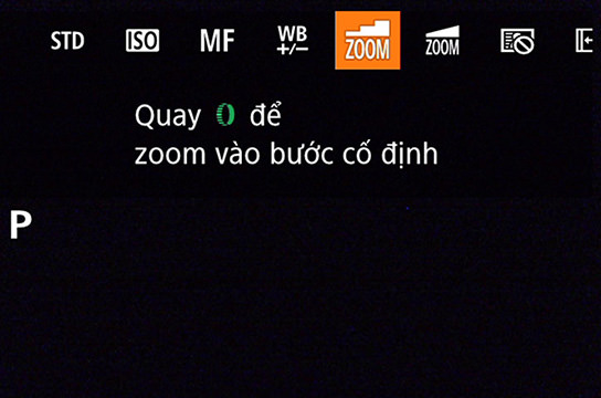 Màn hình thời gian chụp khi gán chức năng zoom bước cho vòng điều khiển. Độ dài tiêu cự tương đương được hiển thị ở dưới cùng của màn hình.