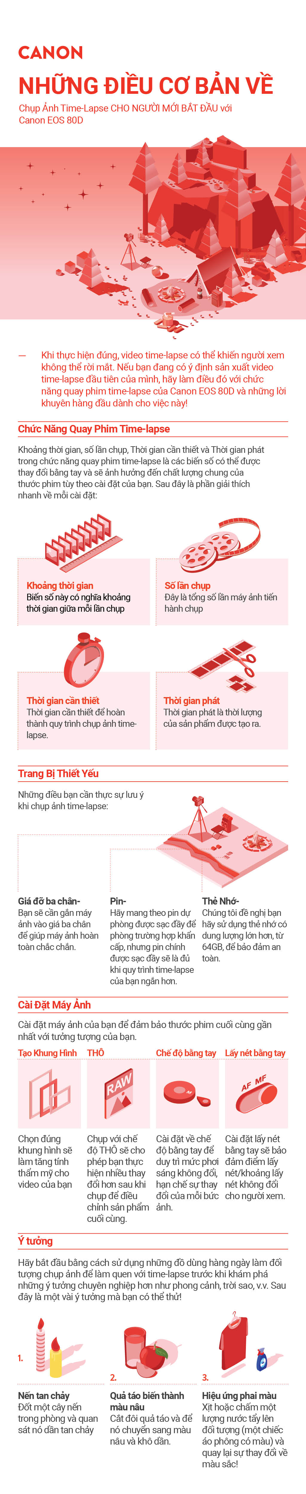 Với chức năng quay phim time-lapse của Canon, bạn có thể giảm khối lượng công tác hậu kỳ cần thiết cho tác phẩm cuối cùng của mình. Nếu bạn đang tìm kiếm máy ảnh Canon có chức năng Time-lapse, chúng tôi xin giới thiệu cho bạn: Canon EOS 80D, Canon 90D, Canon EOS 77D và Canon 800D cho người mới bắt đầu Canon EOS R cho người đam mê nhiếp ảnh.