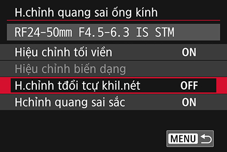 Trên ống kính chúng tôi sử dụng (RF24-50mm f/4.5-6.3 IS STM), “Distortion correction” không khả dụng theo mặc định. Tuy nhiên, trước tiên bạn có thể phải bật tính năng chỉnh méo (distortion correction) trên các ống kính nhất định, chẳng hạn như RF24-70mm f/2.8L IS USM.