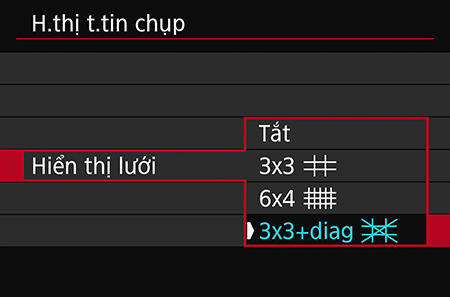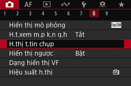 Bước 1: Vào trình đơn màu đỏ. Chọn “Shooting info. disp.”