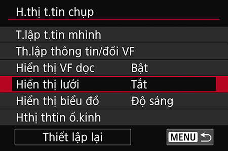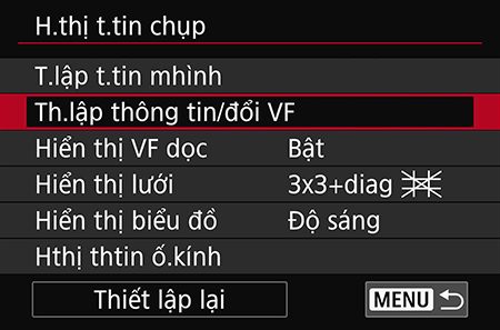 Để xem cân bằng điện tử trên màn hình EVF, chọn “VF info/toggle settings” và lặp lại Bước 3 và Bước 4. Lưu ý: Không thể chỉnh sửa màn hình VF đầu tiên.
