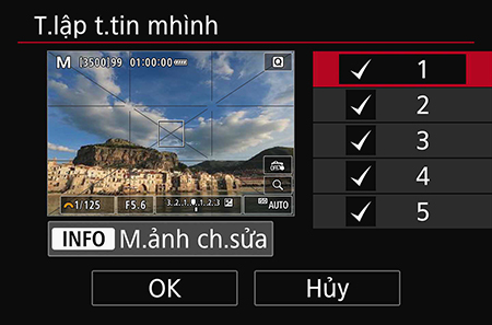 Bước 3: Chọn (các) màn hình hiển thị mà bạn muốn hiển thị cân bằng điện tử. Nhấn nút INFO để chỉnh sửa. Thủ thuật chuyên nghiệp: Khi chụp, bạn có thể sử dụng nút INFO để chuyển đổi giữa các lớp phủ khác nhau.