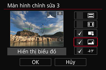 Để xem biểu đồ trên màn hình EVF, chọn “VF info/toggle settings” và lặp lại Bước 3 và Bước 4. Lưu ý: Không thể chỉnh sửa màn hình VF đầu tiên.