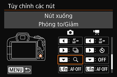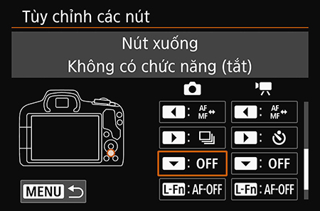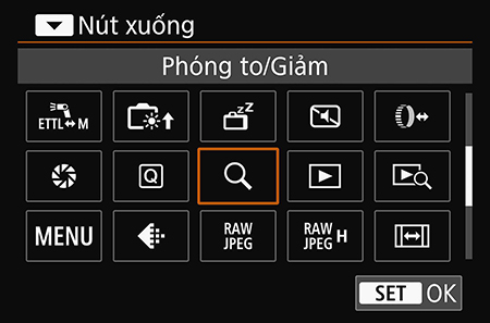 Bước 2: Chọn nút để gán chức năng và nhấn SET. Vì mục đích của bài viết này, chúng tôi chọn nút xuống, nút này không có chức năng nào khác khi chụp ở chế độ Live View trên EOS R50.